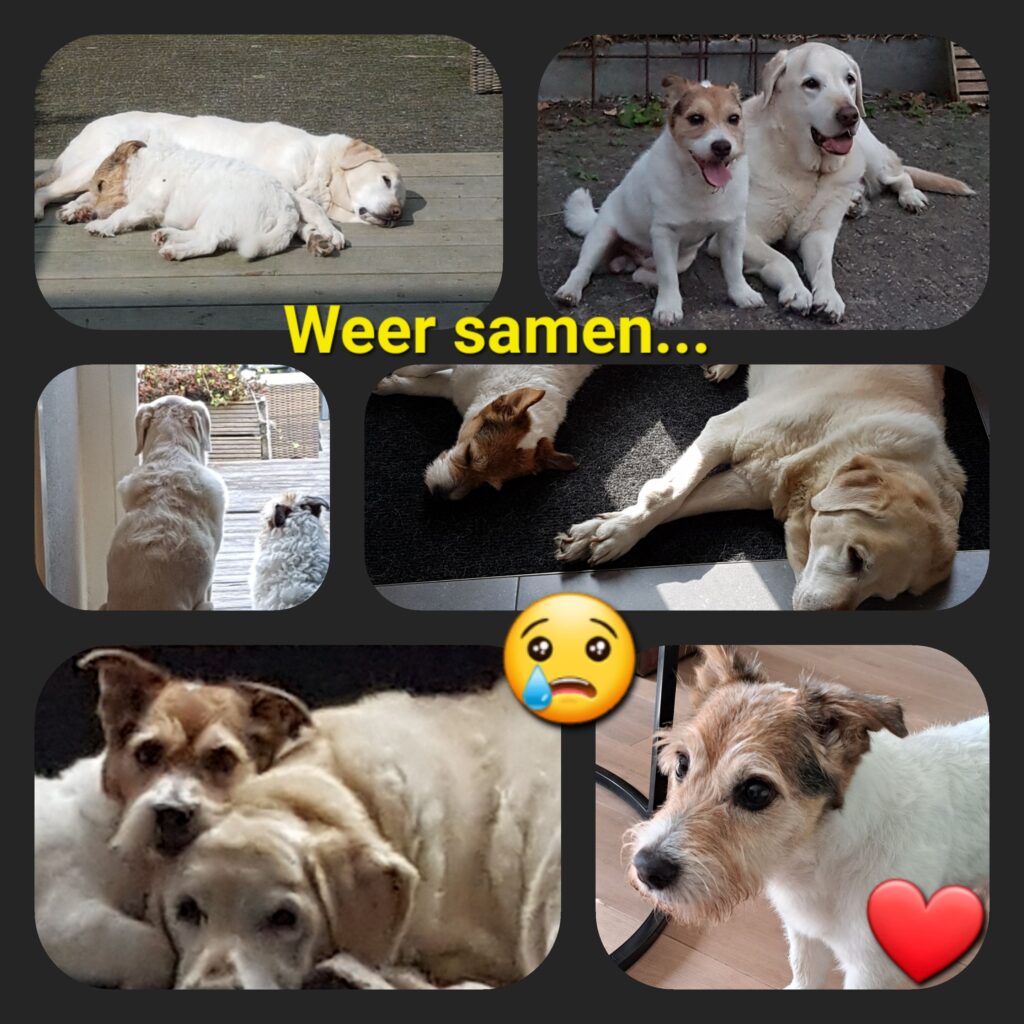 Jarenlang waren deze twee lieverds onafscheidelijk. Samen wandelen, samen zwemmen, samen in de modder, samen onder de tuinslang en samen slapen. Zelfs als wij op vakantie gingen, gingen zij samen naar het pension.